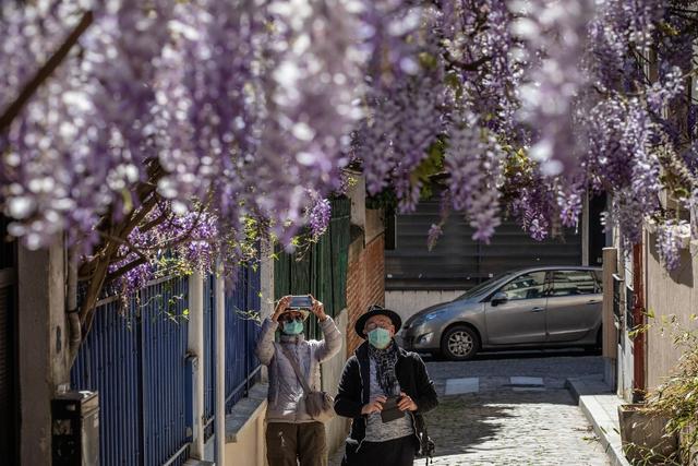 4月15日,在法国巴黎,人们戴着口罩为盛放的鲜花拍照。BFMTV4电视台4月18日报道称,自从新冠肺炎疫情开始,法国从其它国家收到了4.39亿个口罩,大多数来自中国,总价值约为2.24亿欧元。